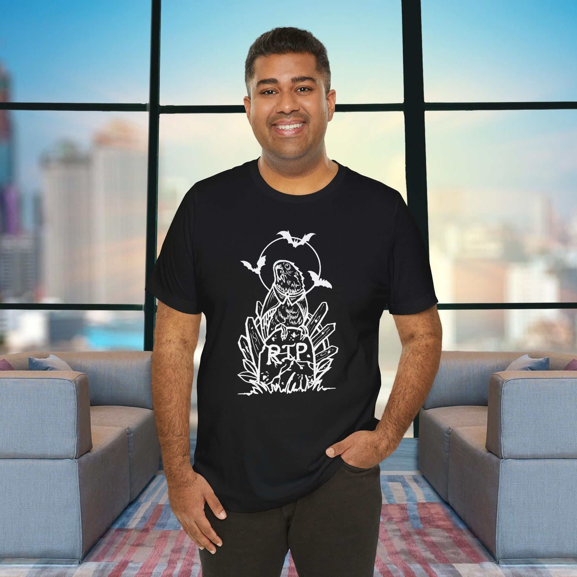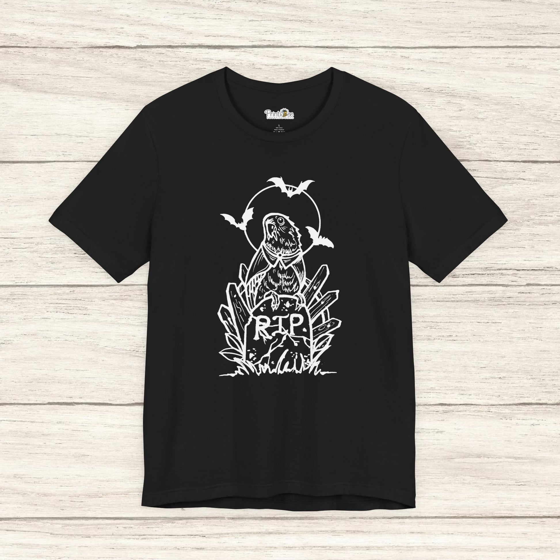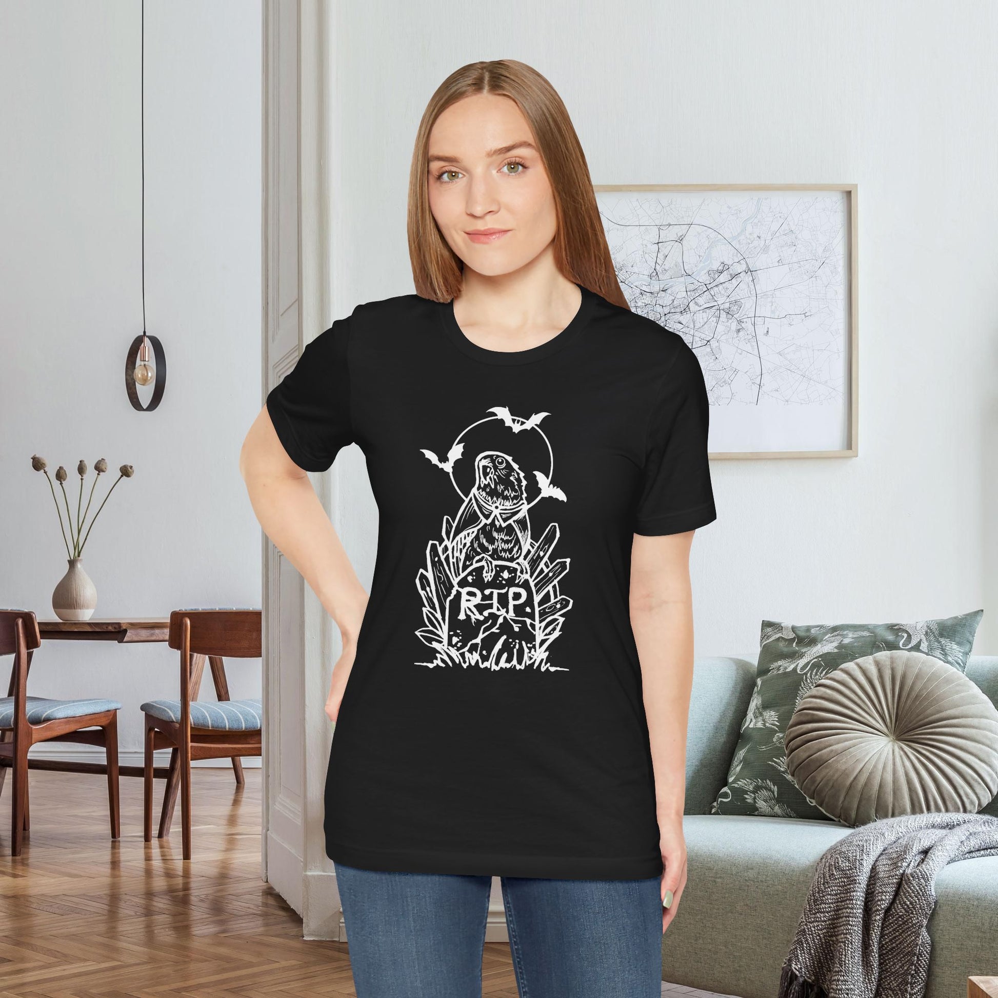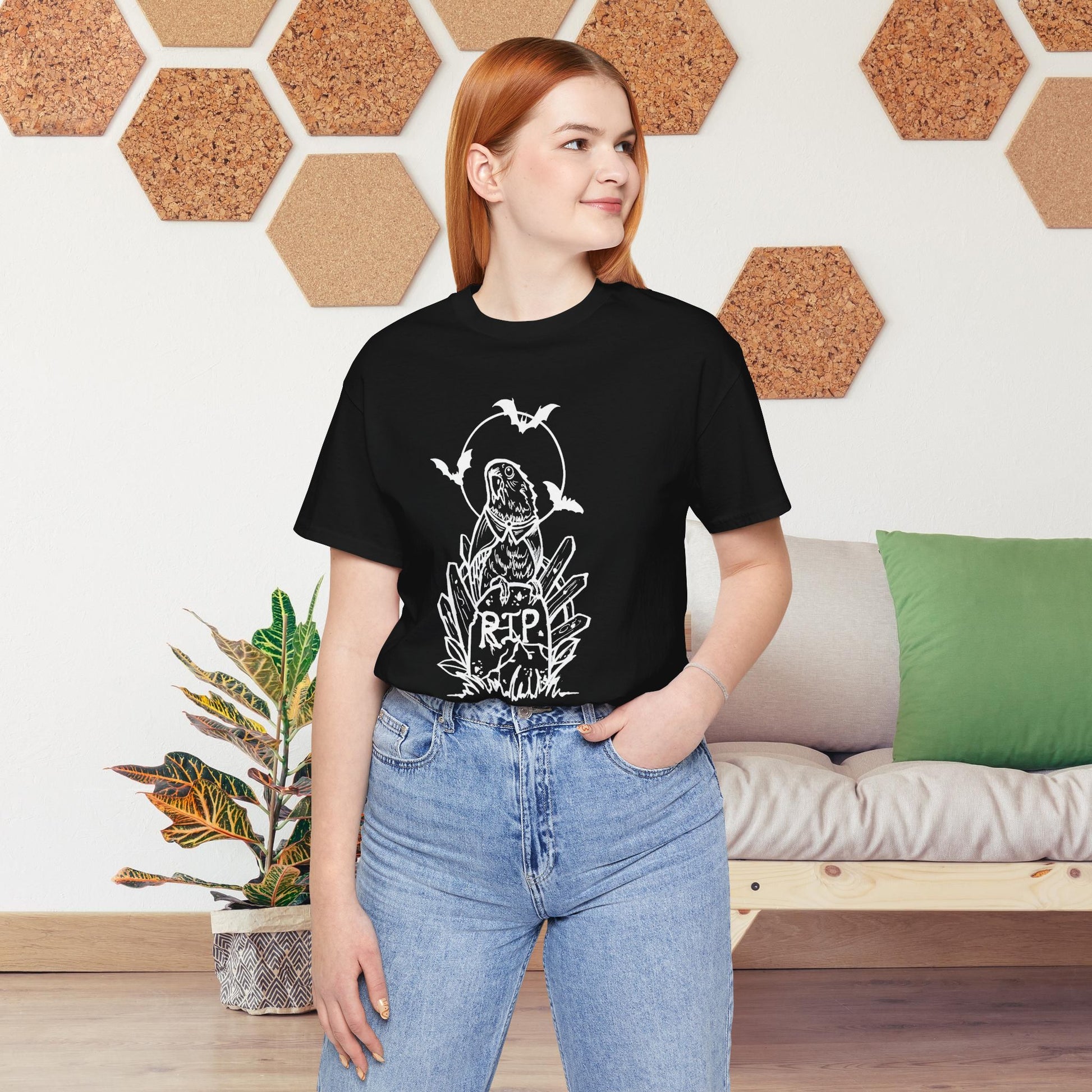 This t-shirt, featuring a vampire lovebird on a tombstone, will help you celebrate Halloween every year! Steve’s line art drawing perfectly captures a hand-drawn lovie evil, but cute vampire that you probably don't want to mess with. This soft shirt provides a comfortable and stylish way to express the connection you two have, making it a perfect addition to your wardrobe. Design © 2025 PrintiBee LLC.